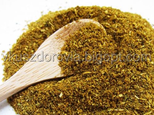 Грузинская сухая приправа, представляет собой смесь пажитника, кориандра, укропа, сельдерея, петрушки, базилика, чабера, мяты, лаврового листа, майорана, красного перца и шафрана.